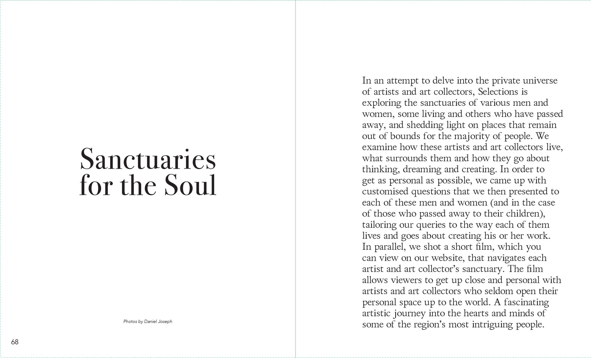 This winter issue is dedicated to mediums. It delves into the world of materials such as paint, clay, fauna and fire to shed light on the relationship between the artist and his or her weapon of choice. We discover artists in their most precious environments by visiting eight different artists in their work spaces. We are also fortunate enough to discuss the works of iconic artists who have passed with their children and grandchildren. Make sure to check out our Sanctuary Visits on www.selectionsarts.com.
