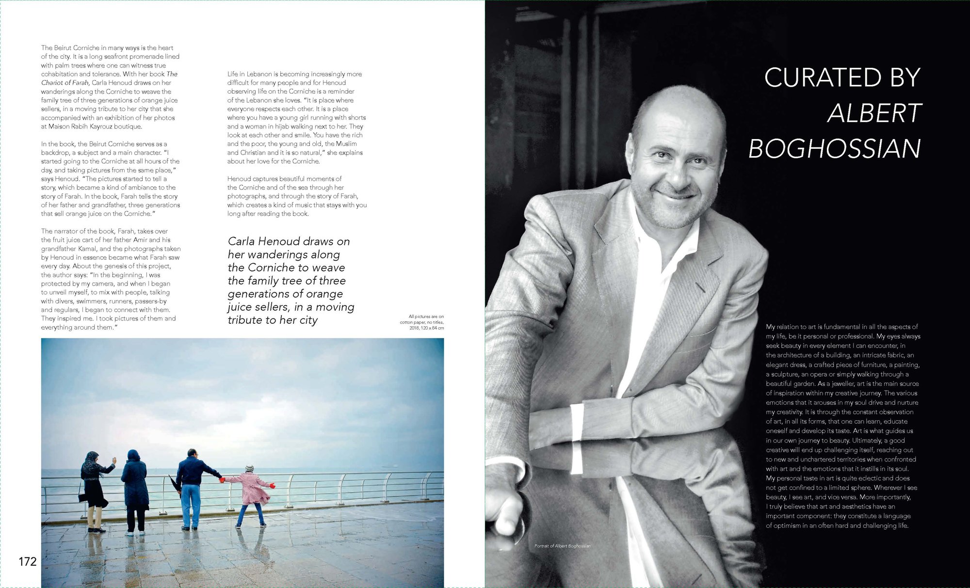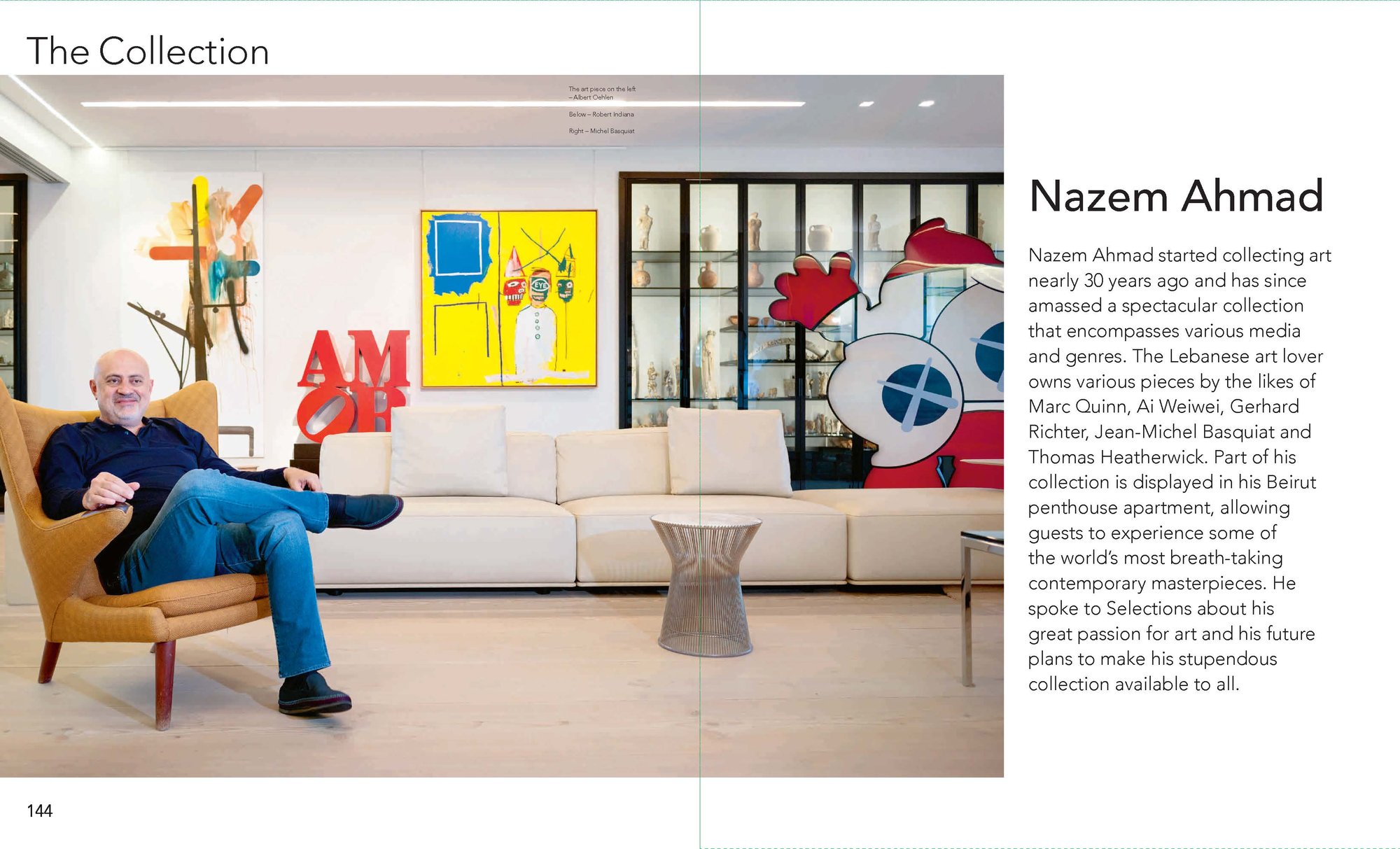 This issue also includes articles on the exhibition held at the Oscar Niemeyer international fair in Tripoli entitled Cycles of Collapsing Progress, the 2018 Byblos Bank Photography awards won by Betty Khetchedjian, the Saradar Collection, another beautiful initiative curated by Sam Bardaouil and Till Fellrath. We are excited to see them at the Venice Art Biennial 2019, curating the UAE pavilion. In the UAE, we celebrated the opening of the long-awaited Jameel Art Centre and its director Antonia Carver whose primary mission is to spread culture. Find a one-on-one interview with Jean Boghossian who took over an landmark building in Downtown Beirut - the old offices of L'Orient-Le Jour. Albert Boghossian shares a sophisticated and varied selection of works in the Curated By section, from refined jewellery created by the family to iconic architecture and what it means to him. Nazem Ahmad takes us deep into his home, to view his impressive collection of art and design.